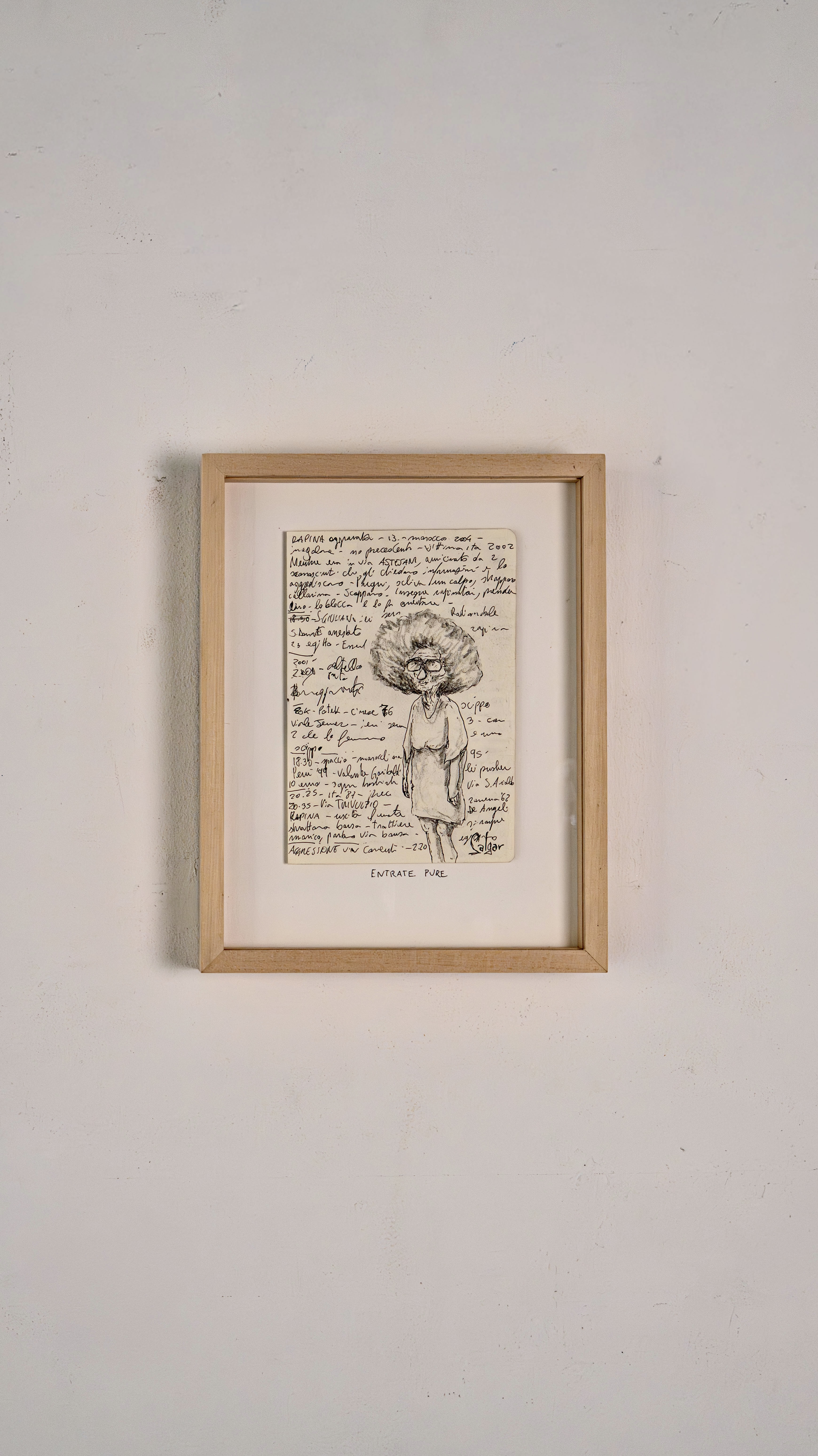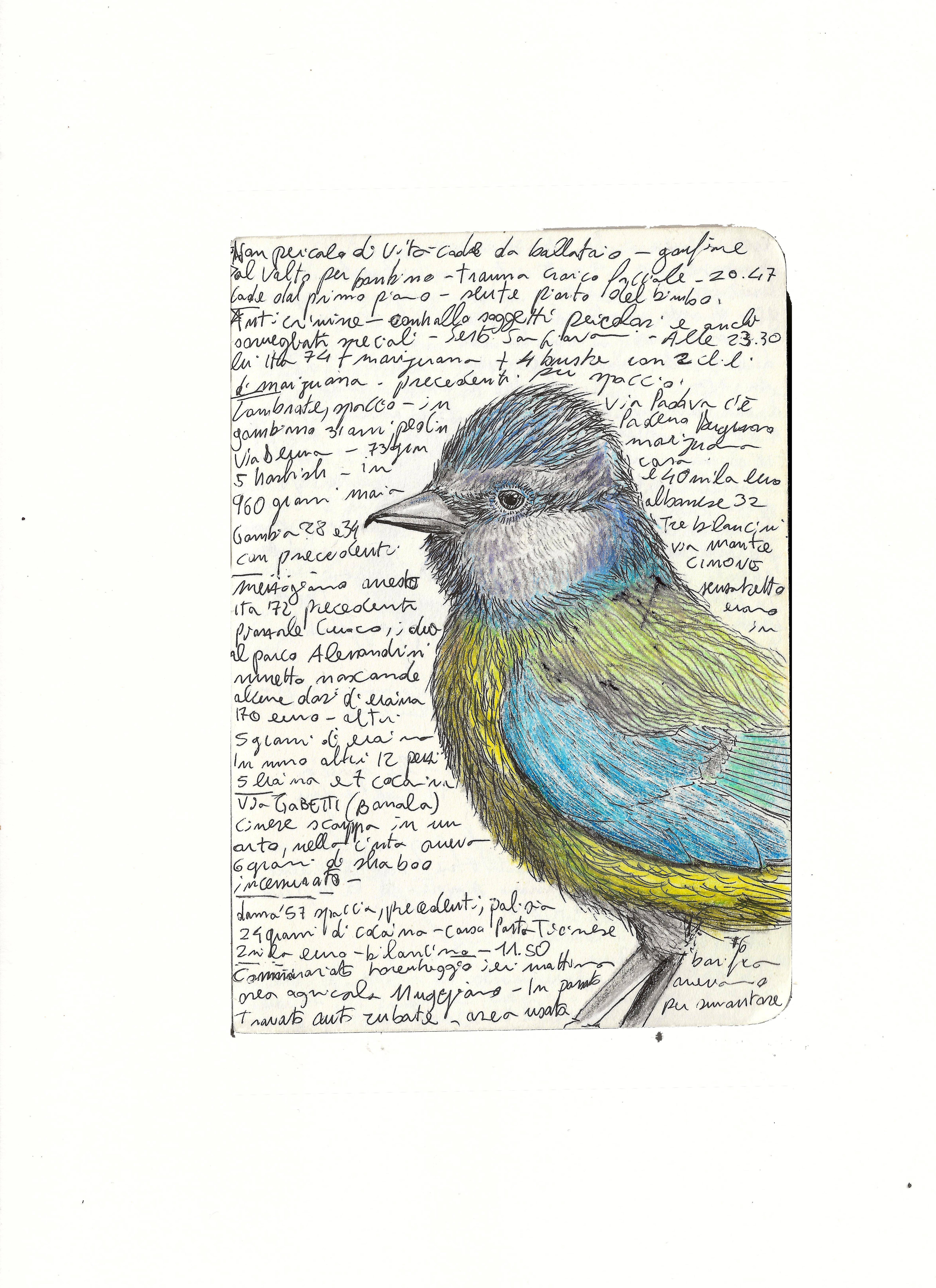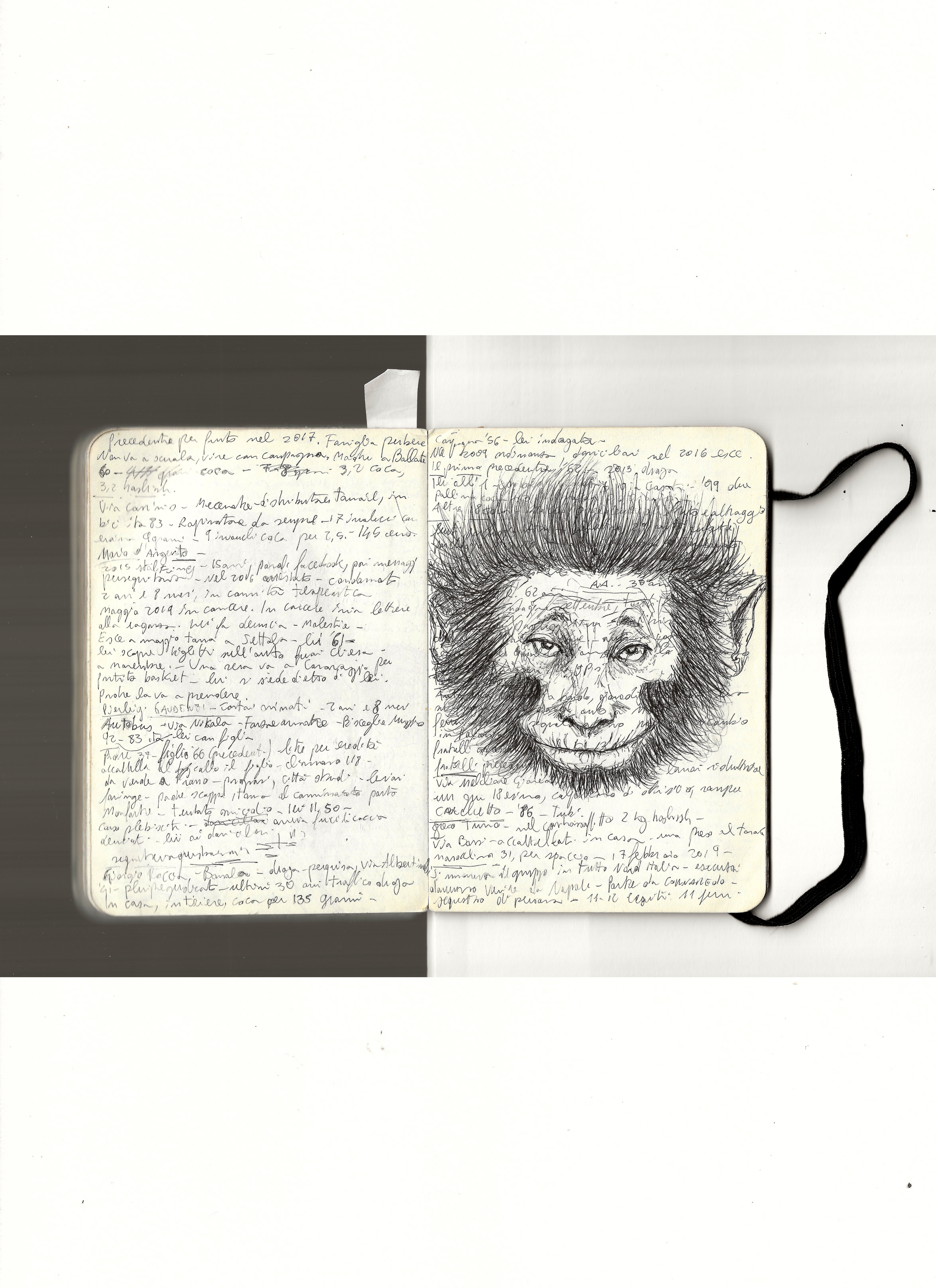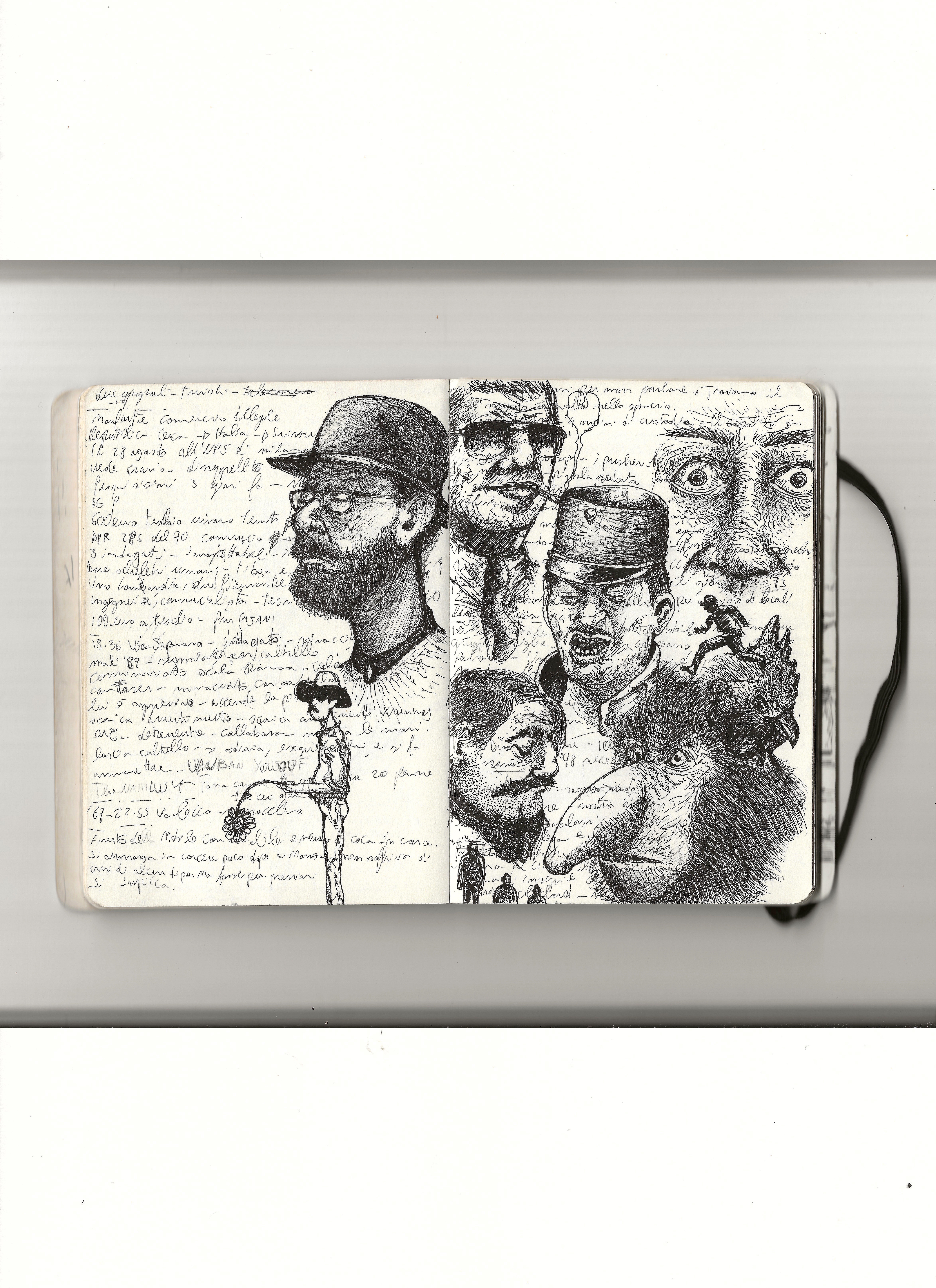 He always carries two pens and draws on anything, even receipts. His best sketches are in the notebook he takes to police stations, crime scenes, and courtrooms, on top of dense pages of notes about the cases he follows daily. The essence of his graphic journalism work is captured in “Il giro di nera”, a column in which he documents and illustrates firsthand crime stories, later adapted into a live performance in the innovative format of “stand-up tragedy.”