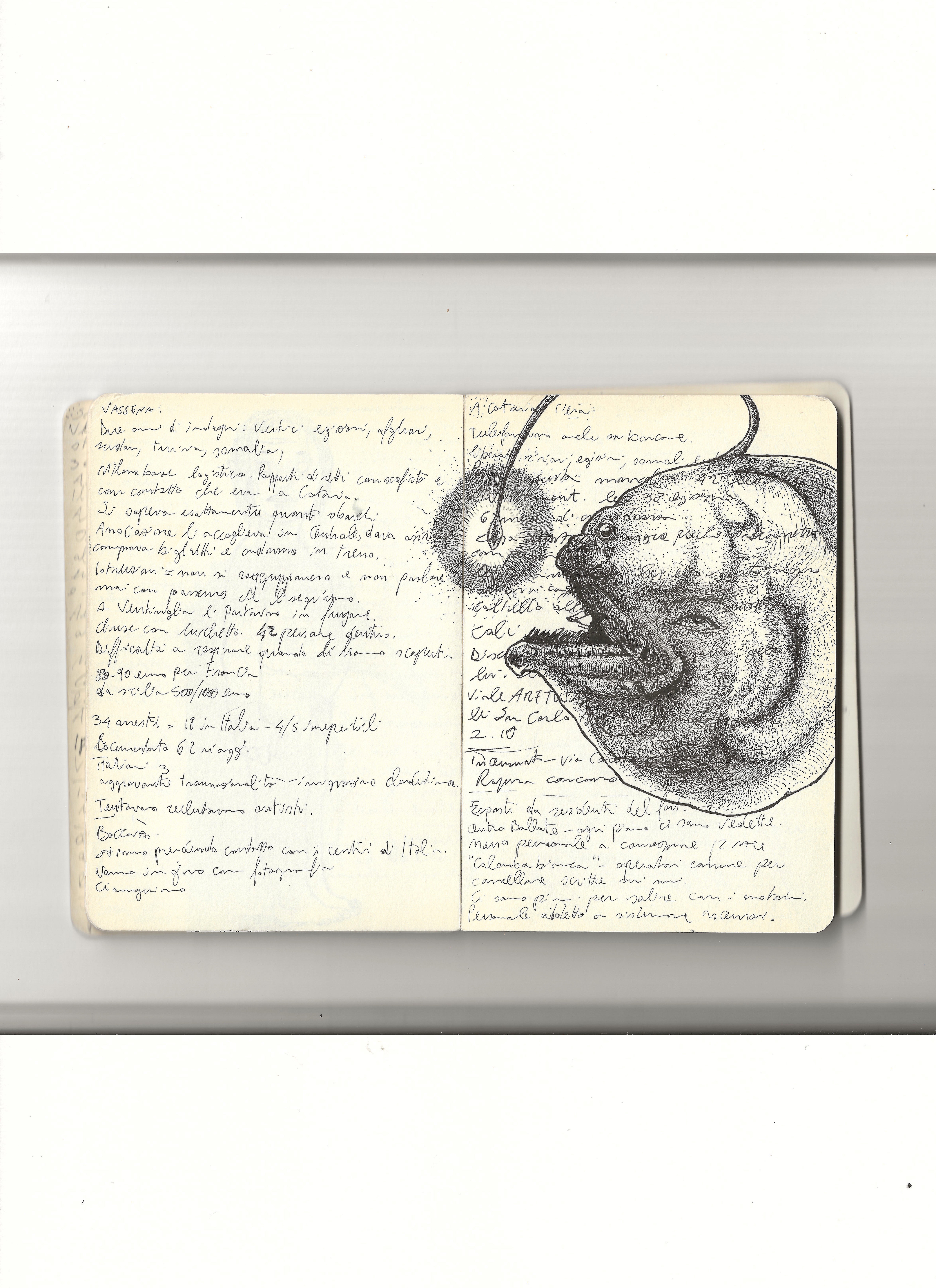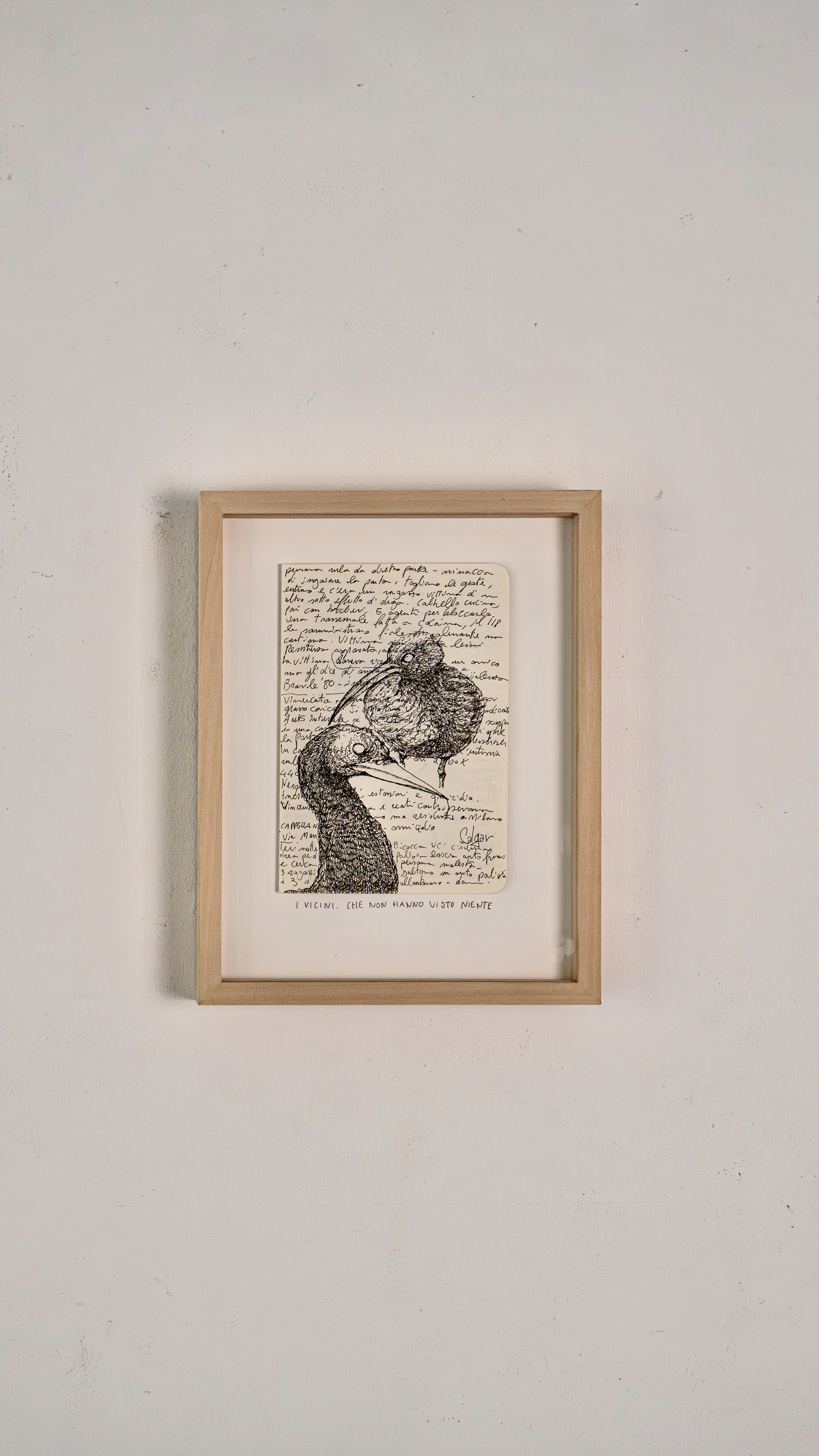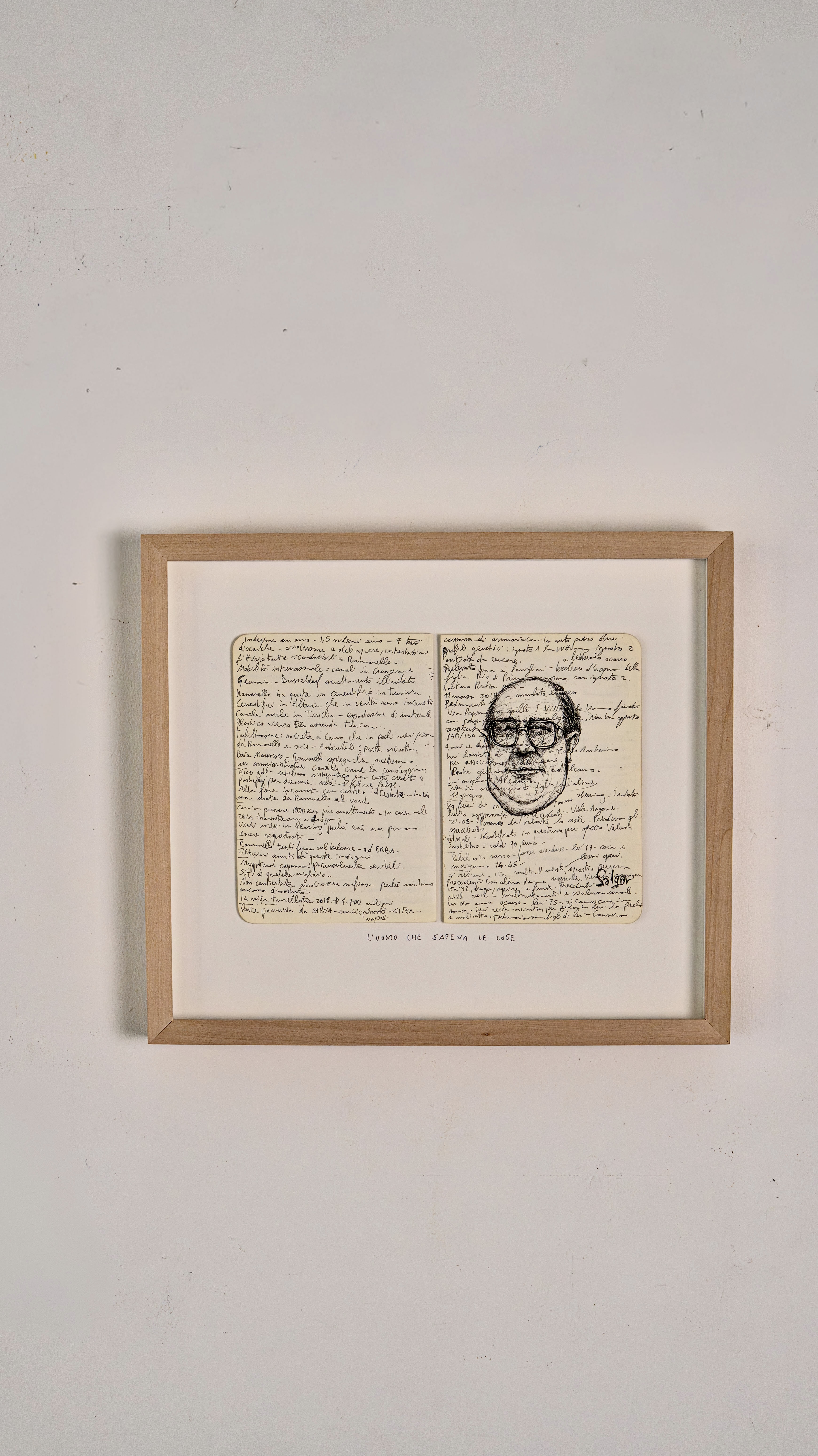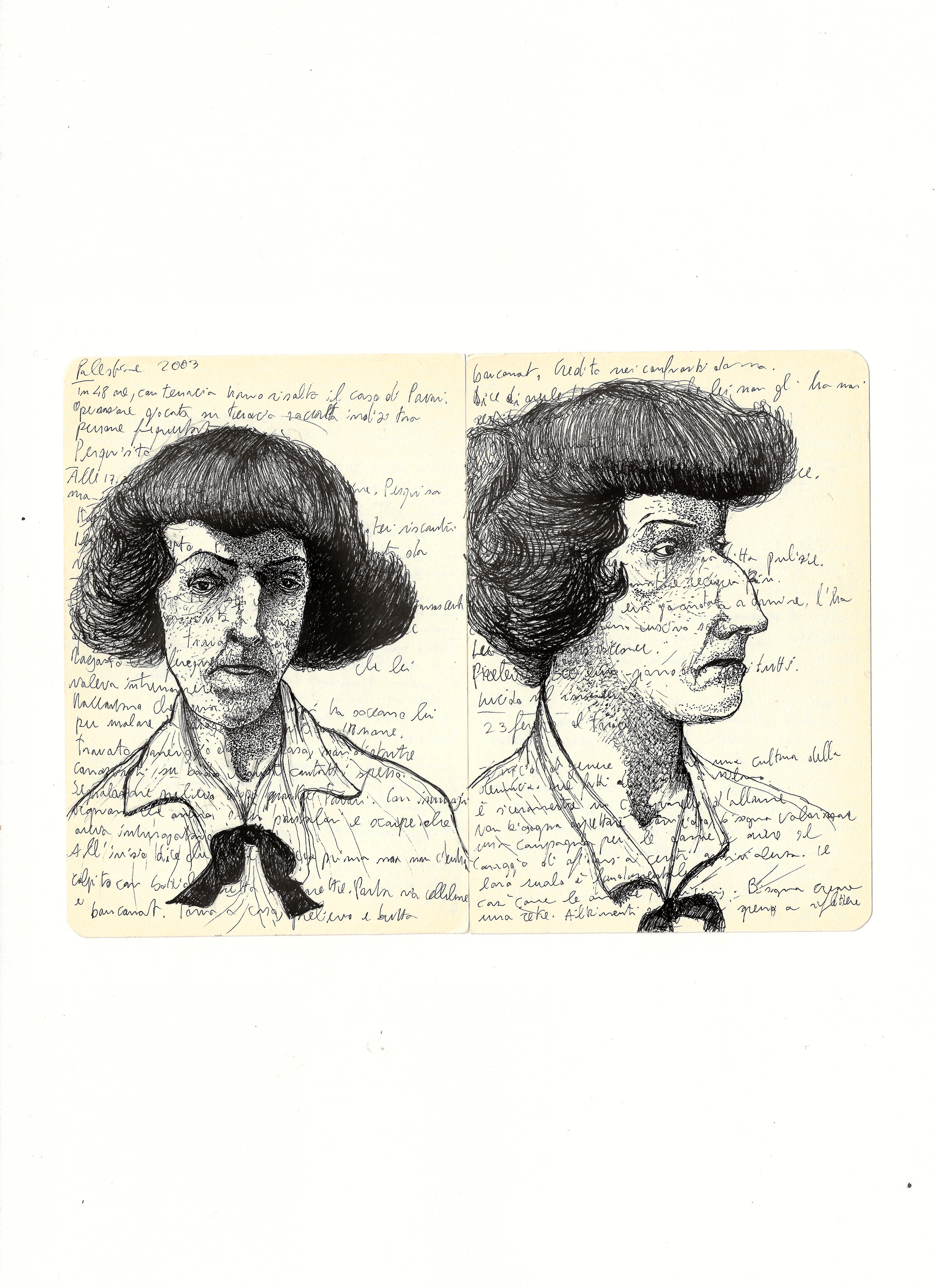 He always carries two pens and draws on anything, even receipts. His best sketches are in the notebook he takes to police stations, crime scenes, and courtrooms, on top of dense pages of notes about the cases he follows daily. The essence of his graphic journalism work is captured in “Il giro di nera”, a column in which he documents and illustrates firsthand crime stories, later adapted into a live performance in the innovative format of “stand-up tragedy.”